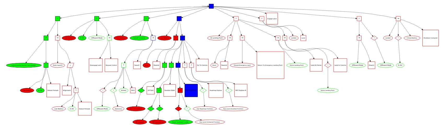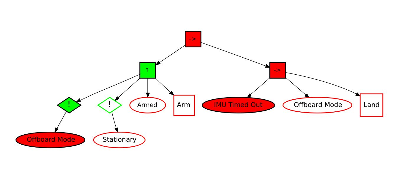 Below shows a typical example where preceding conditions must be true in order for an action to be performed. In this case the drone will land if the IMU times out and it is in offboard mode
